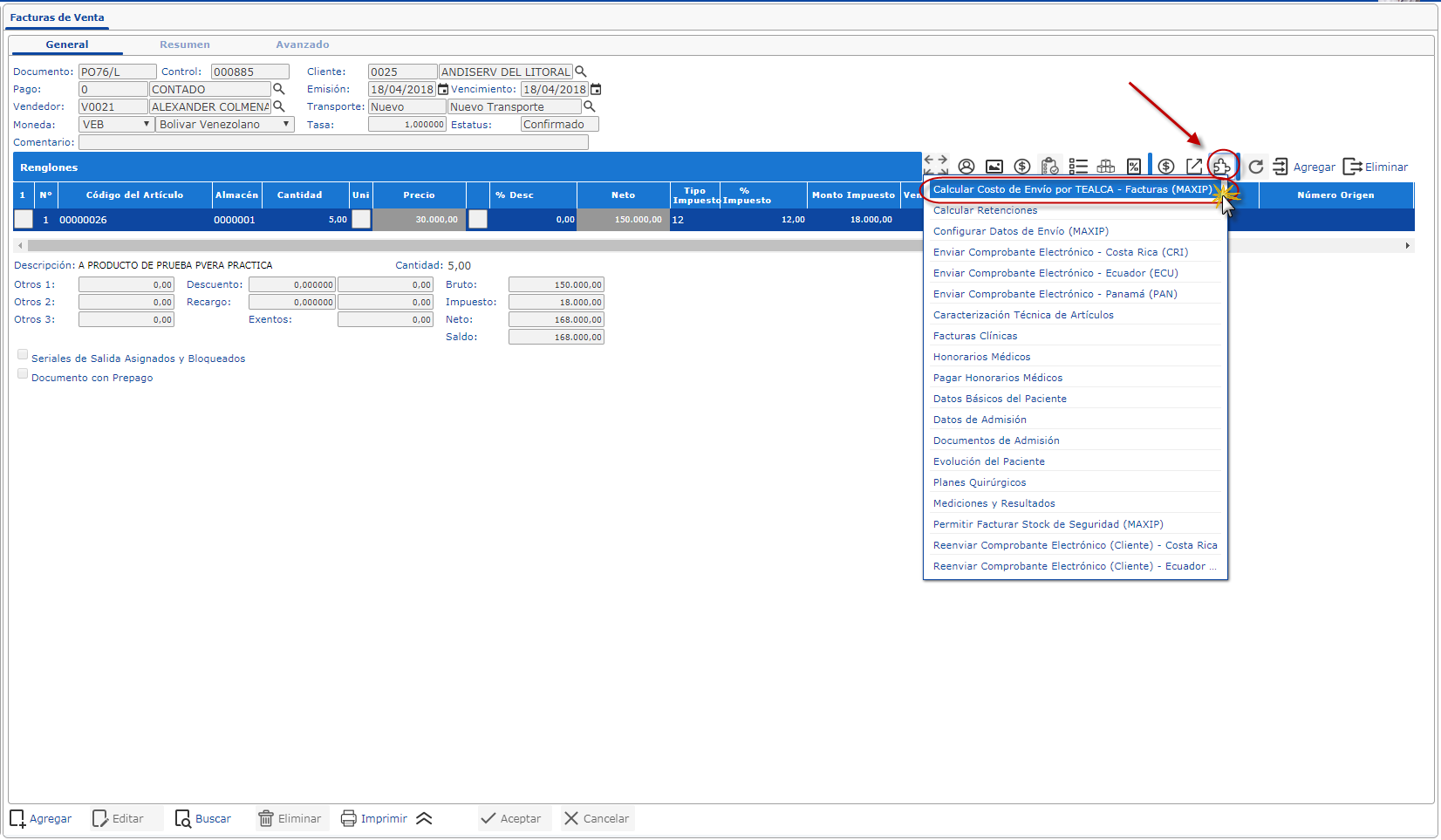 NOTA: Se puede calcular costo de envío por TEACLA en Facturas de Ventas, Pedidos y Notas de Entrega