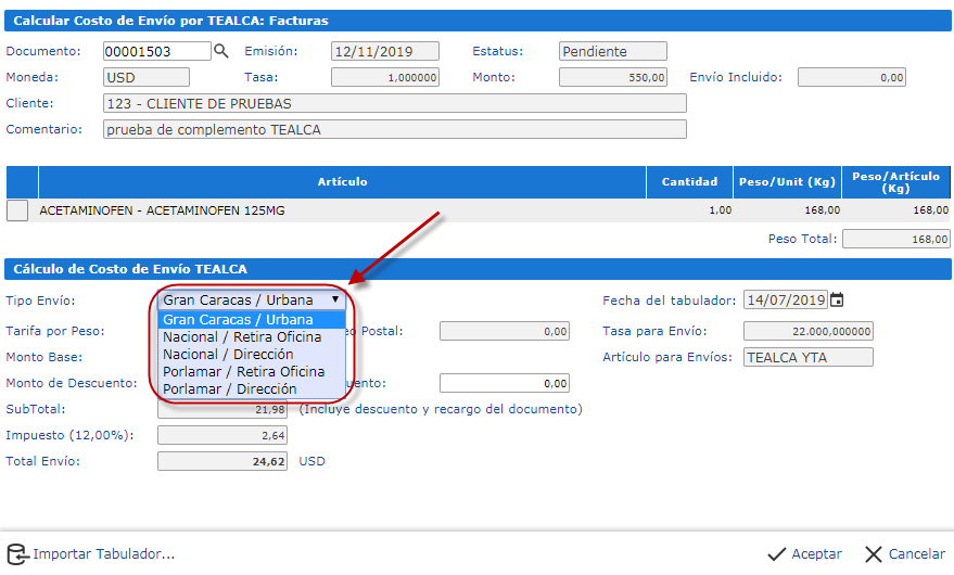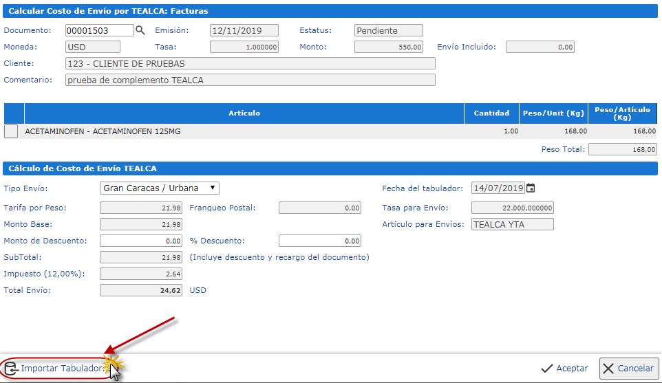 También se mostrarán los renglones del documento con sus pesos asociados (Excepto el artículo de envío: "TEALCA YTA"), más abajo, en la sección de Cálculo de Costo de Envío TEALCA