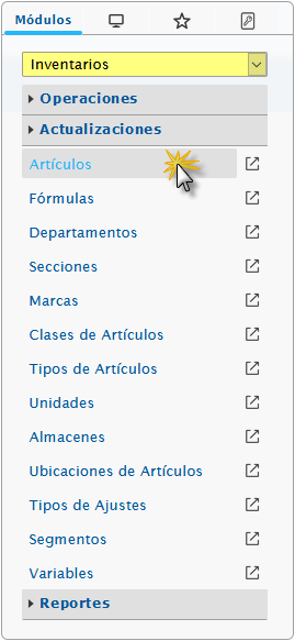 a. Al ingresar en el sistema debemos seleccionar el módulo Inventarios y al desplegar la sección de Actualizaciones seleccionaremos la opción de Artículos.