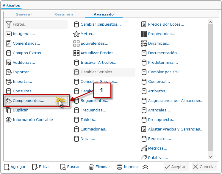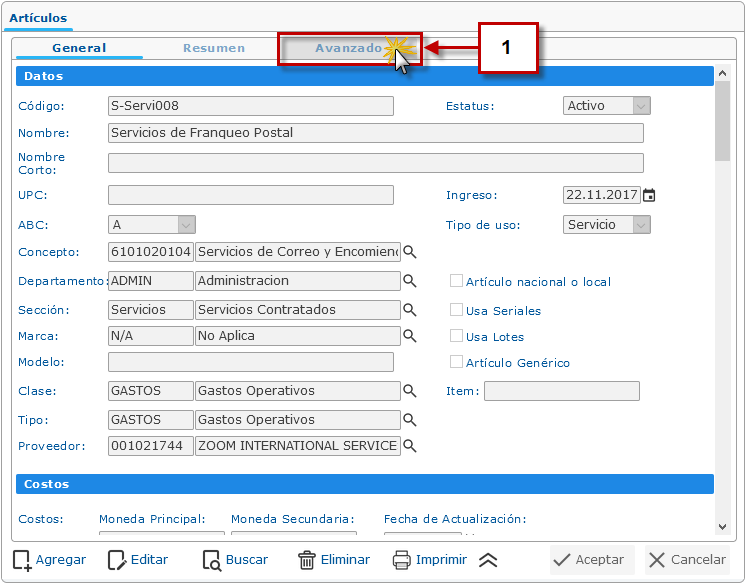 a. Luego de haber seleccionado la opción de Artículos se muestra la pantalla donde procedemos a hacer clic en la pestaña Avanzado.