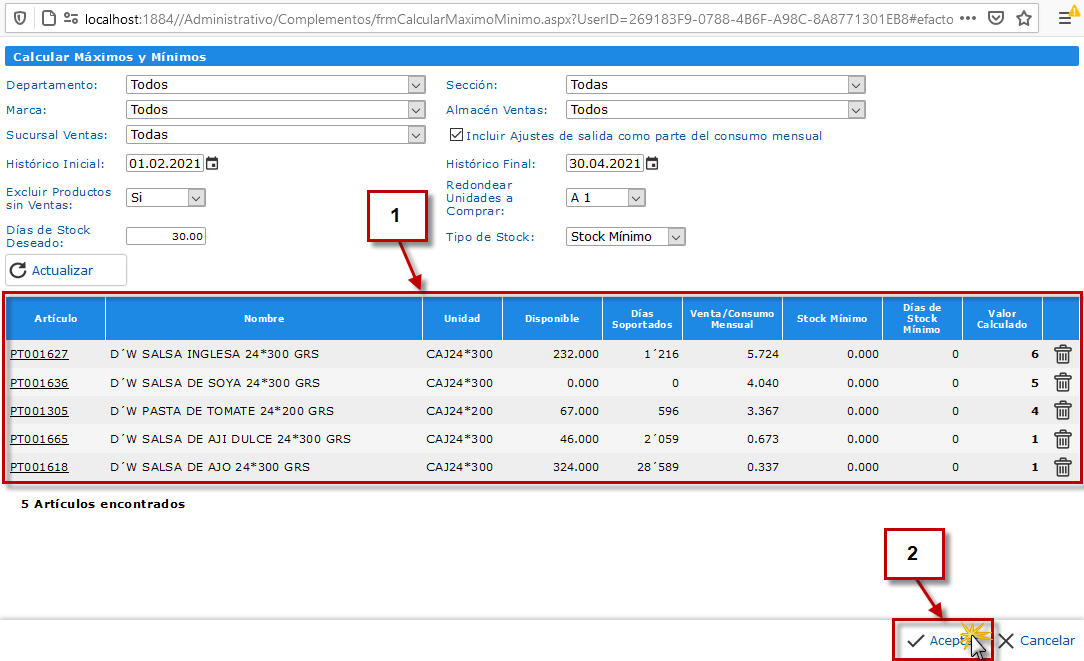 , se cargará la tabla de la parte inferior con los artículos encontrados y los valores calculados para cada uno de estos.