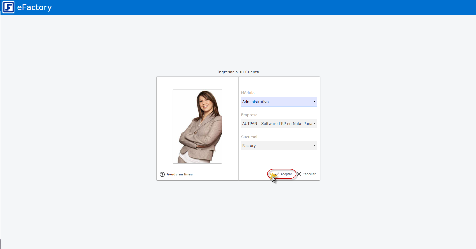 a. Para ingresar debemos iniciar en eFactory con nuestro Usuario, Contraseña, y seleccionaremos el botón