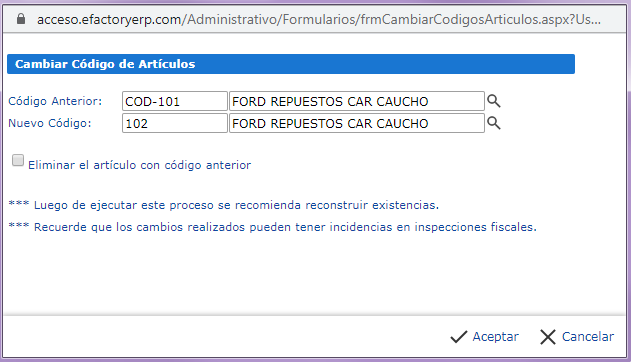 , pero para eso tenemos que tener registrado el nuevo código para poder cambiar el código anterior por el nuevo.Nota: Después de realizar este procedimiento se recomienda reconstruir existencias, También recuerden que los cambios realizados pueden tener incidencias en inspecciones fiscales.