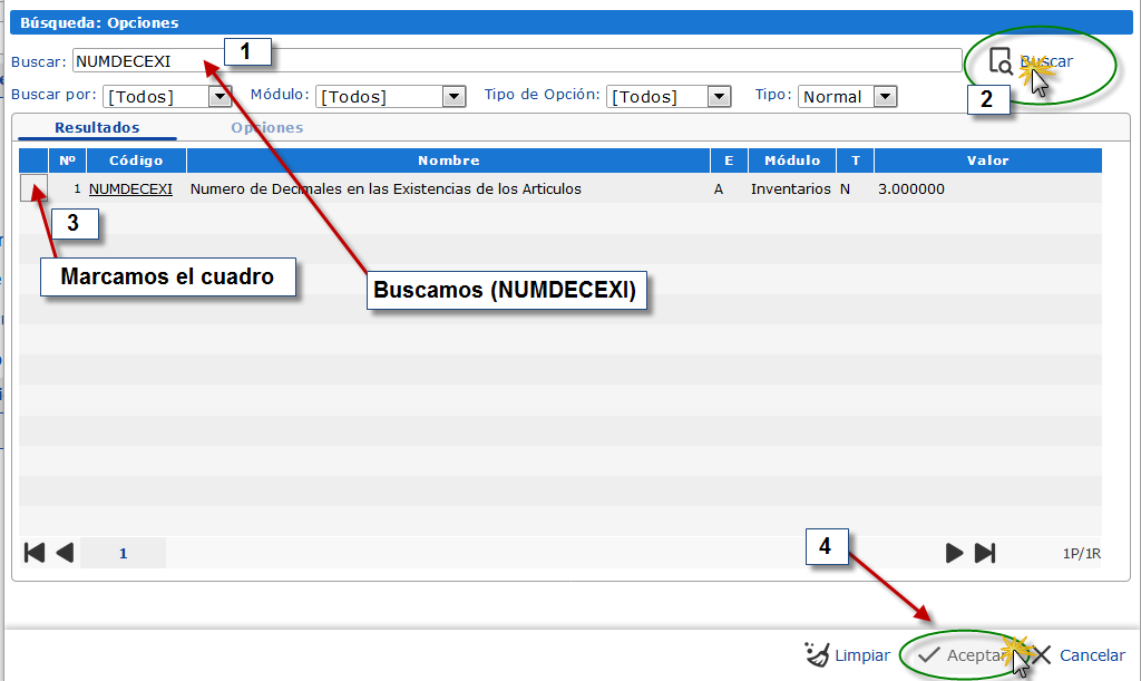 ; donde nos permitirá Buscar el campo para cambiar la cantidad de decimales en existencias.