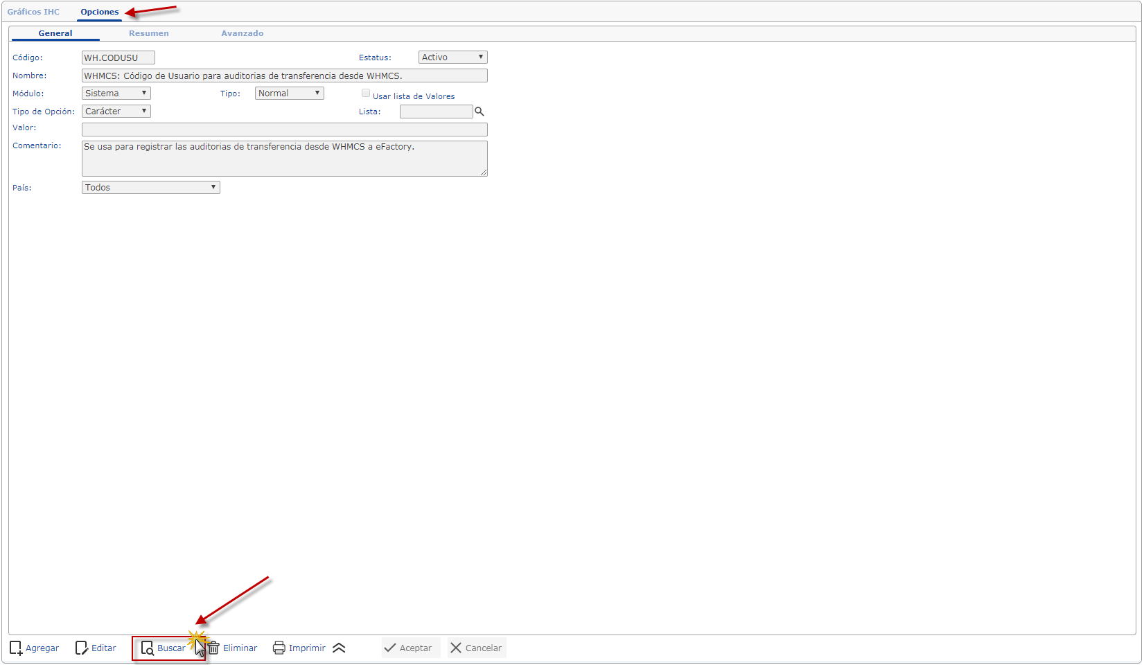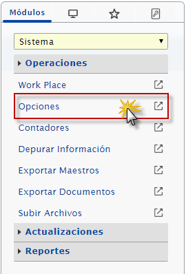 b. Después de Ingresar al sistema nos ubicamos en el menú y seleccionaremos el módulo Sistema, desplegamos el componente Operaciones y activamos el maestro de Opciones.