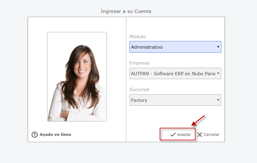 seleccionaremos el Módulo Administrativo, Empresa y Sucursal de la Empresa y presionaremos el botón