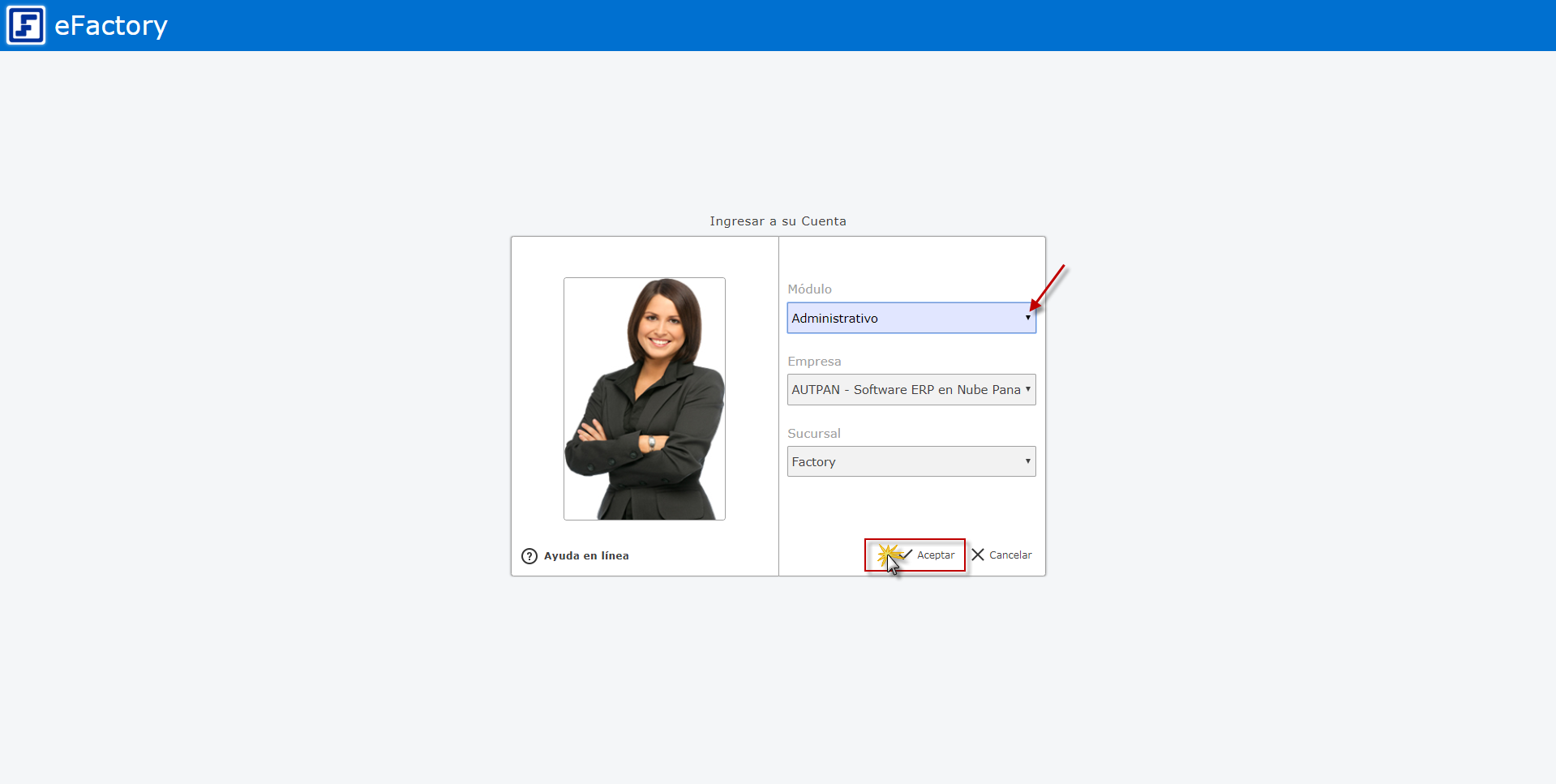 a. Para ingresar debemos iniciar en eFactory con nuestro Usuario, Contraseña, y seleccionaremos el botón