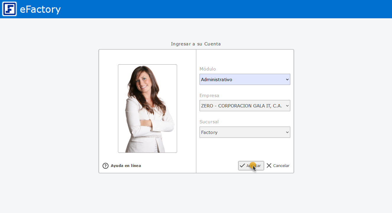 Primero debemos ingresar al sistema de eFactory colocando nuestro usuario y contraseña en la pantalla inicial de eFactory, luego presionaremos el botón de
