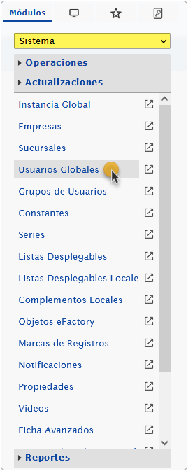 a. Al ingresar en el sistema debemos seleccionar el módulo Sistema y al desplegar la sección de Actualizaciones seleccionaremos la opción de Usuarios Globales.