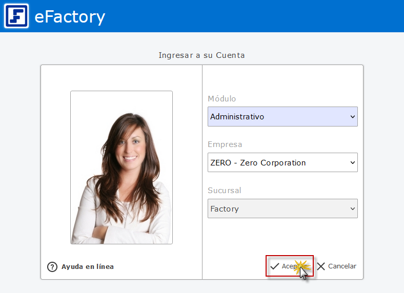 Primero debemos ingresar al sistema administrativo de eFactory colocando nuestro usuario y contraseña en la pantalla inicial de eFactory, luego presionaremos el botón de