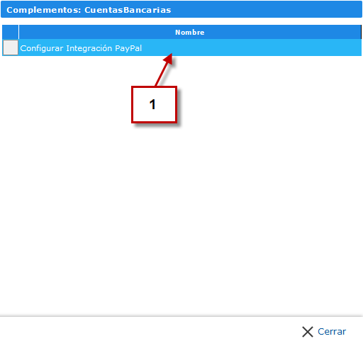 c. Al abrir la pantalla de Complementos: CuentasBancarias, debemos seleccionar la opción Configurar Integración PayPal.
