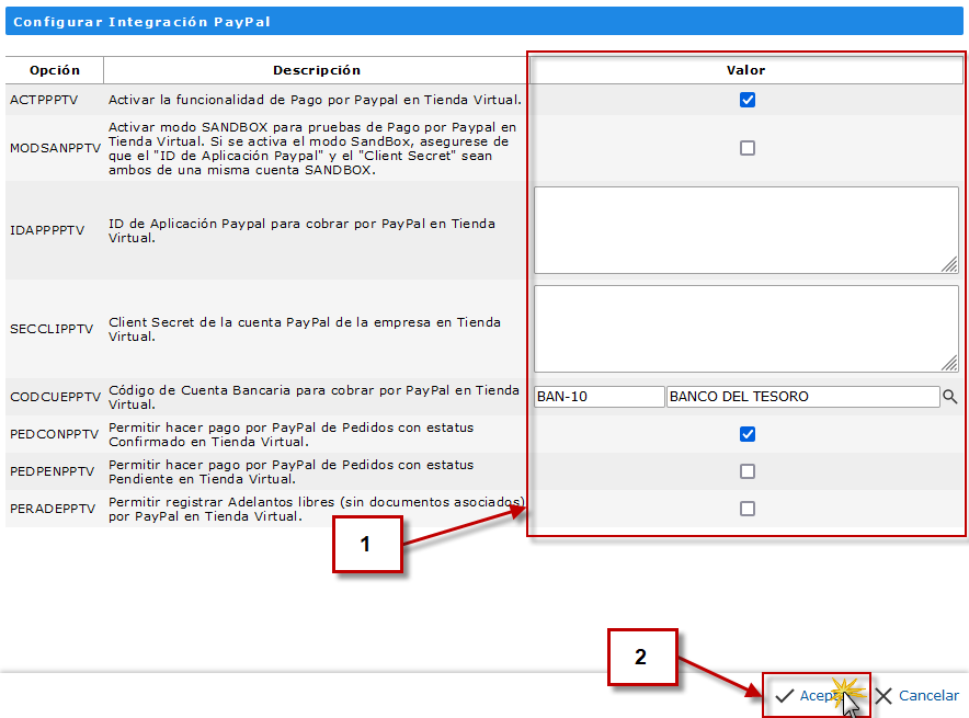 a. Luego de haber seleccionado la opción Configurar Integración PayPal se abrirá el complemento en el que debemos configurar las Opciones y presionar el botón