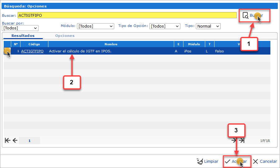 se abrirá la pantalla de Búsqueda: Opciones, en esta primero debemos buscar y seleccionar la opción