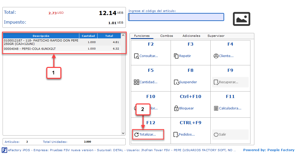 c. Despues de ingresar todos los artículos que se facturarán, debemos presionar F12 o hacer clic en el botón