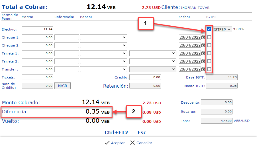 Nota: Esto calculará el IGTF asumiendo que el monto pagado en otra moneda incluye el IGTF y se generará un monto de Diferencia por el IGTF calculado, que el cliente deberá pagar en Bs.