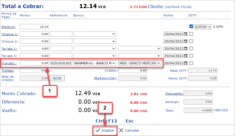 c. Por último, despues de indicar las formas de pago del cliente, con su IGTF, debemos hacer clic en el botón
