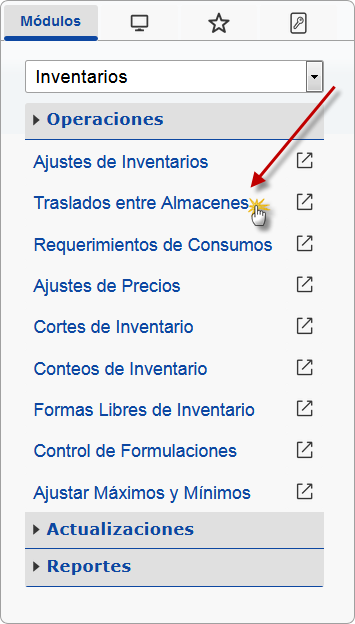 b. En el módulo Inventarios, desplegamos el componente Operaciones y activamos el sub componente "Traslado Entre Almacenes".