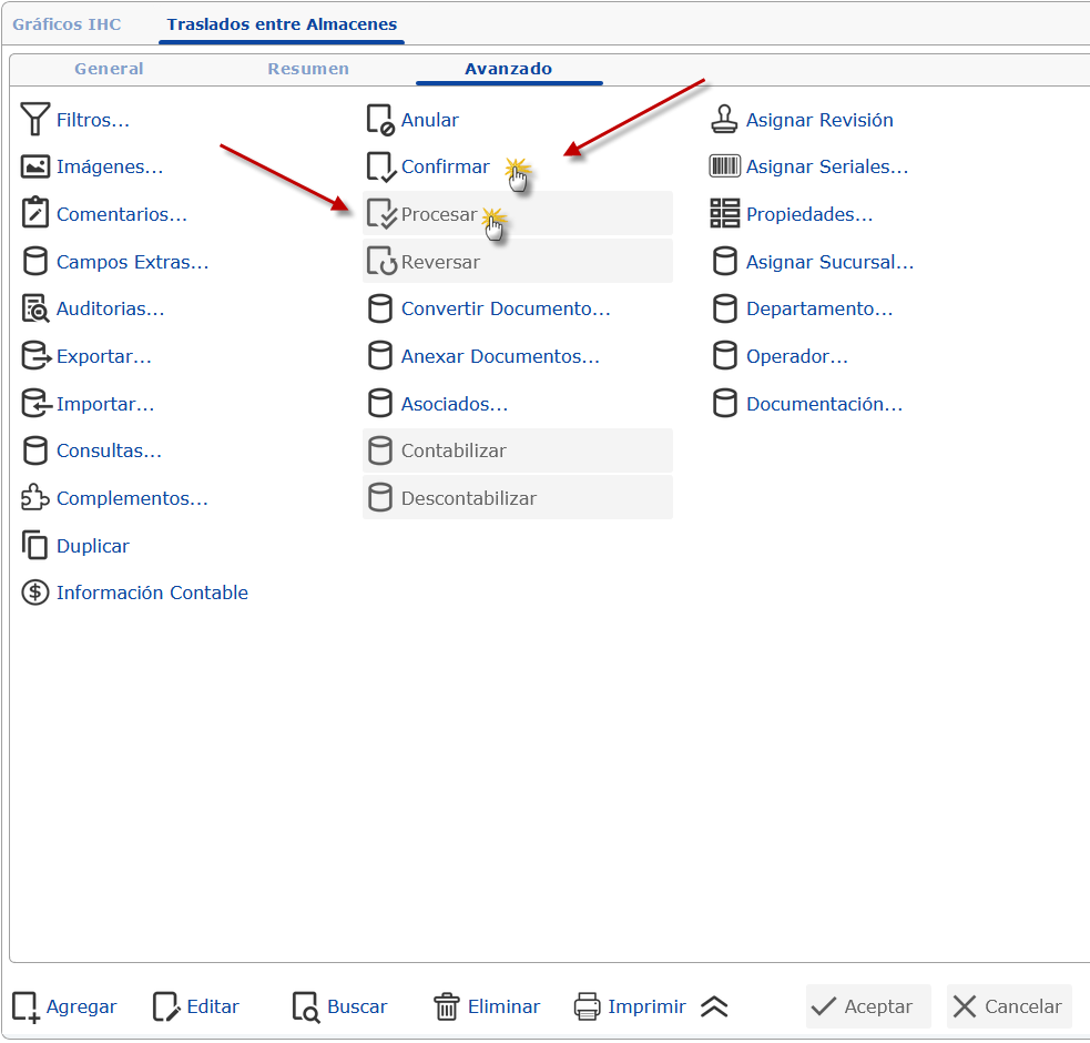 b. Para finalizar solo deberemos confirmar y procesar el traslado para ello deberemos ir a la ficha de "Avanzados" y presionaremos primero el bóton "Confirmar" luego de hacer esto se nos desbloqueara la opción "Procesar", la presionaremos y se nos procesara el traslado exitosamente.