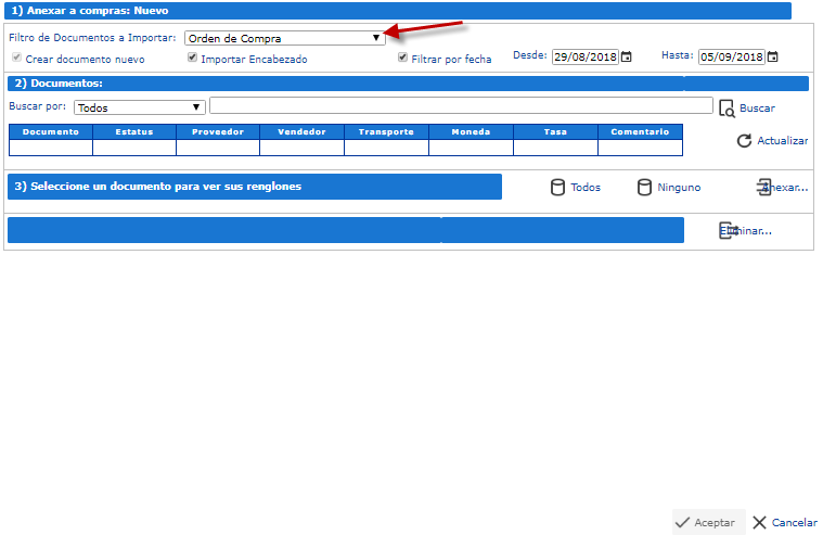 b. Aparece un Formulario para Anexar el Documento, en la sección 1, campo Filtro de Documentos a Importar seleccionamos el item Orden de Compra.
