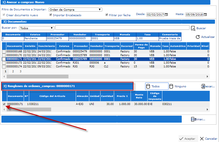 a. Al haber seleccionado en la sección 2, la Orden de Compra, la sección 3 nos muestra una tabla con los Renglones asociados, en donde debemos marcar aquellos que queremos añadir en la Factura de Compra.