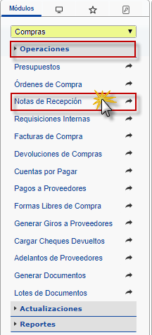 b. En el módulo Compras, desplegamos el componente Operaciones, activamos el sub componente Notas de Recepción.