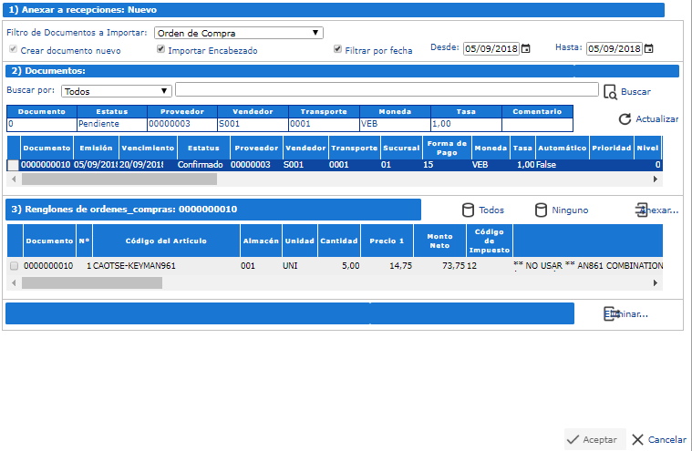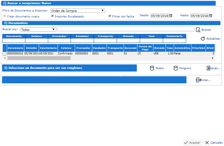 b. Aparece un Formulario para Anexar el Documento, en la sección 1, campo Filtro de Documentos a Importar seleccionamos el item Orden de Compra.