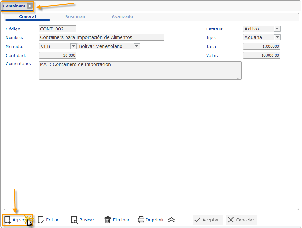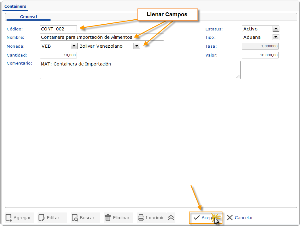 Moneda: Seleccionamos la moneda utilizada para administrar el Container, en caso de ser una divisa, debemos especificar la Tasa Cambiaria.