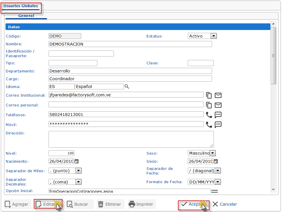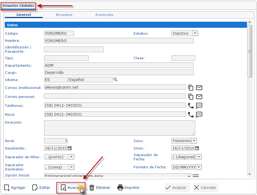 a. Se muestra la ventana Usuarios Globales, para editar accesos, primero debemos ubicar cuál Usuario vamos a modificar; presionamos el botón