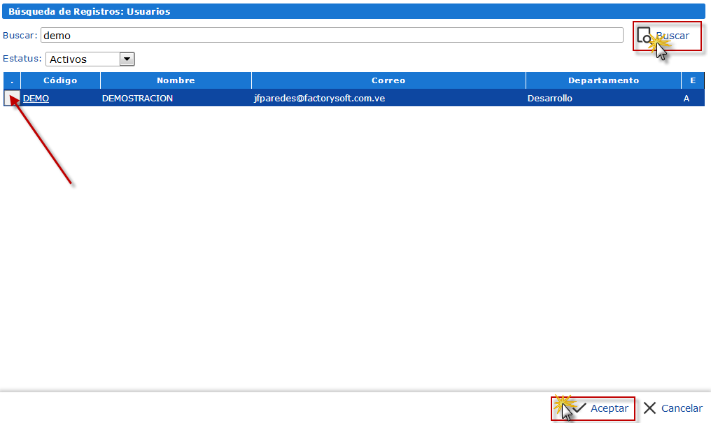 Aparece un listado reducido a los criterios de búsqueda especificados, procedemos a seleccionar aquel Usuario que vamos a modificar, presionando el cuadro ubicado a su izquierda y luego el botón