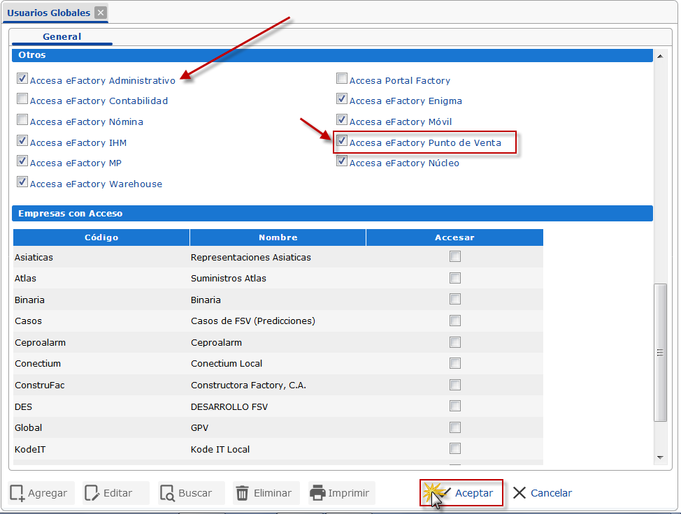 Nos dirigimos hasta la sección Otros, allí marcamos la casilla de verificación Accesa a eFactory Punto de Venta.