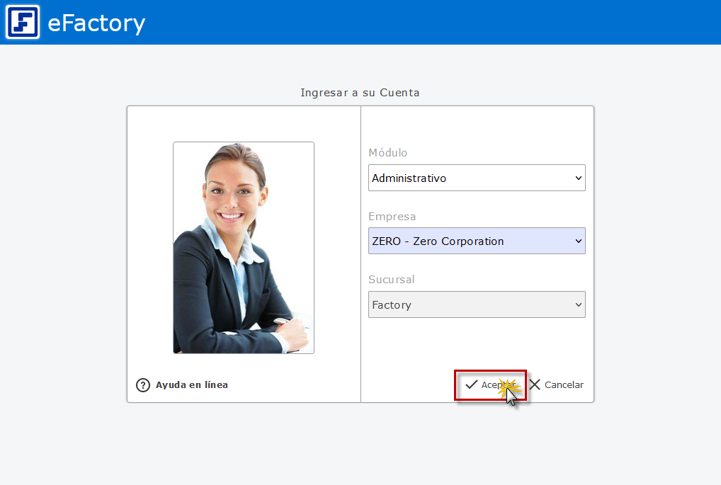 Primero debemos ingresar al sistema de eFactory colocando nuestro usuario y contraseña en la pantalla inicial de eFactory, luego presionaremos el botón de