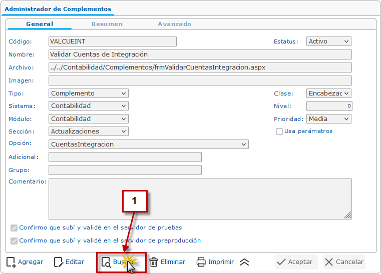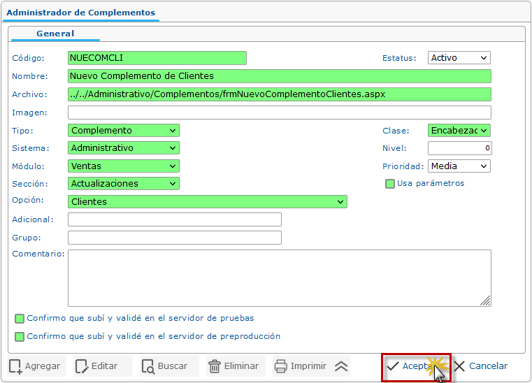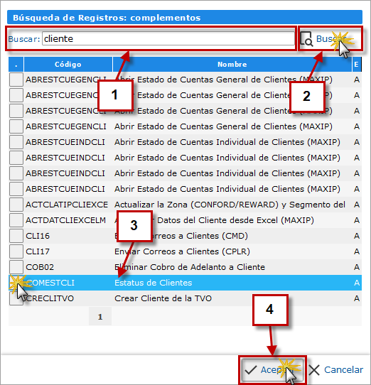 utilizando los filtros del formulario (Sistema, Opción y Complemento) y por último debemos presionar el botón