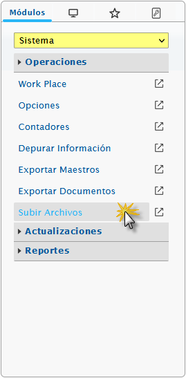 a. Al ingresar en el sistema debemos seleccionar el módulo Sistema y al desplegar la sección de Operaciones seleccionaremos la opción de Subir Archivos.