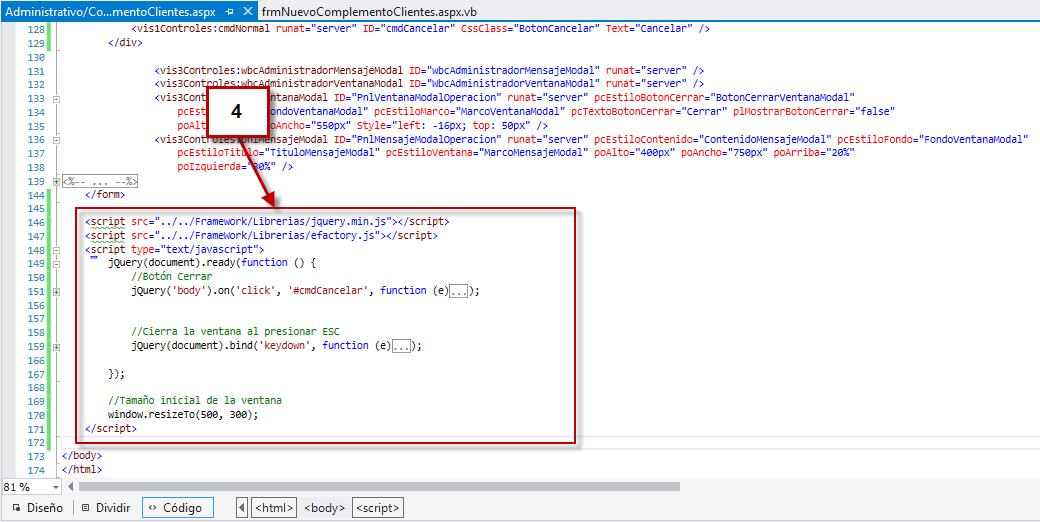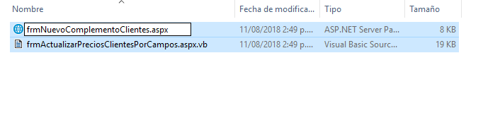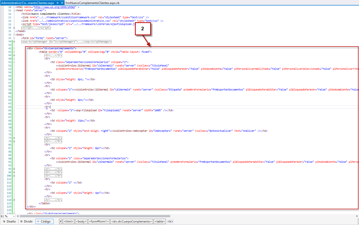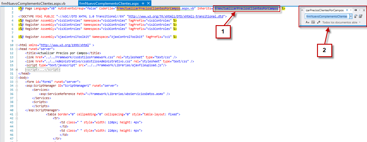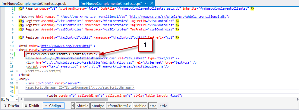 1. En el archivo .aspx: Este es el archivo en el que se programa la apariencia visual del complemento, en este archivo debemos editar: