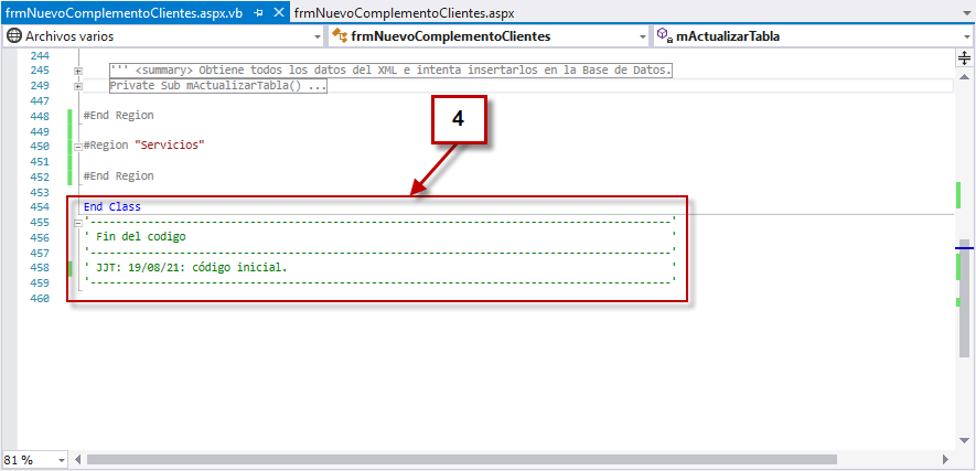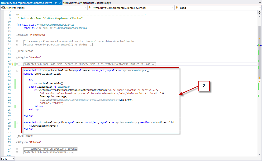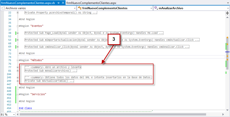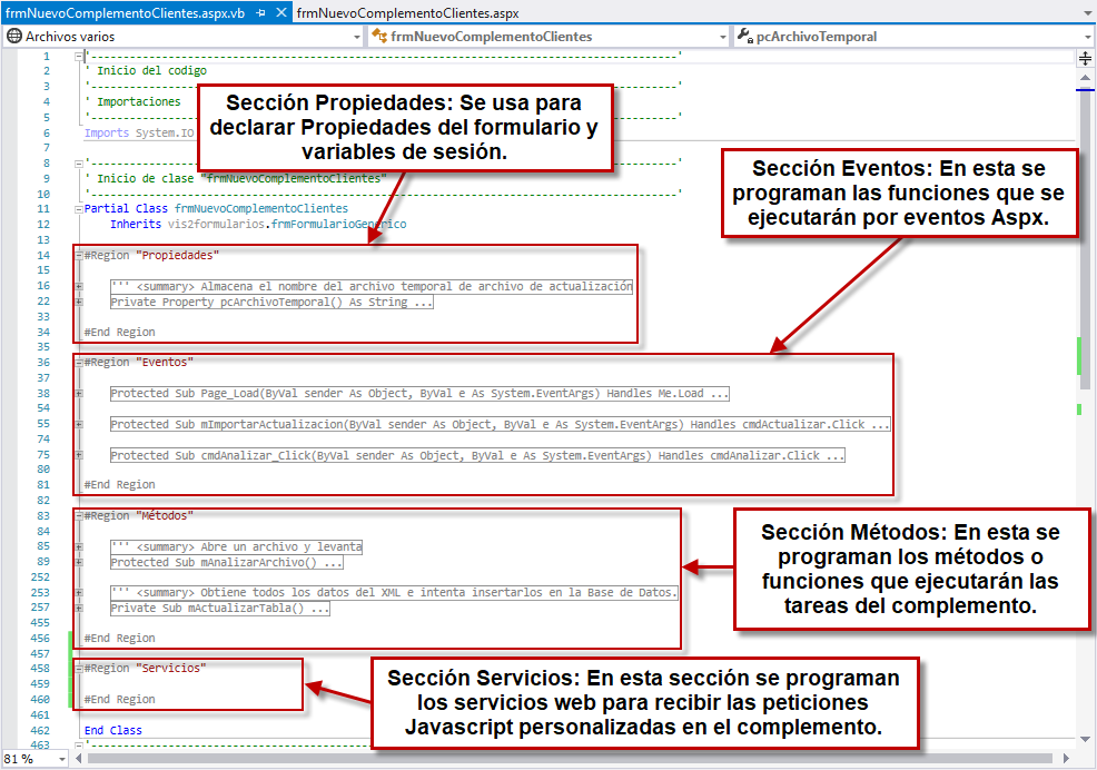 2. En el archivo .aspx.vb: Este es el archivo que ejecuta las funciones del complemento del lado del servidor y se encarga de hacer las consultas a Base de Datos. Este archivo cuenta con secciones o regiones que nos permiten mantener el código ordenado, estas regiones son: