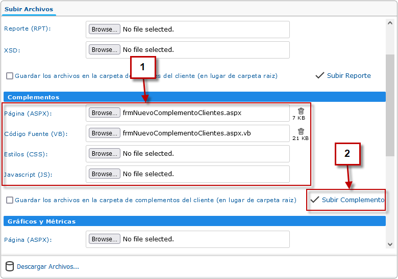 b. Luego de haber seleccionado la opción de Subir Archivos se muestra la pantalla donde debemos subir los archivos (aspx, vb) en la sección Complementos y