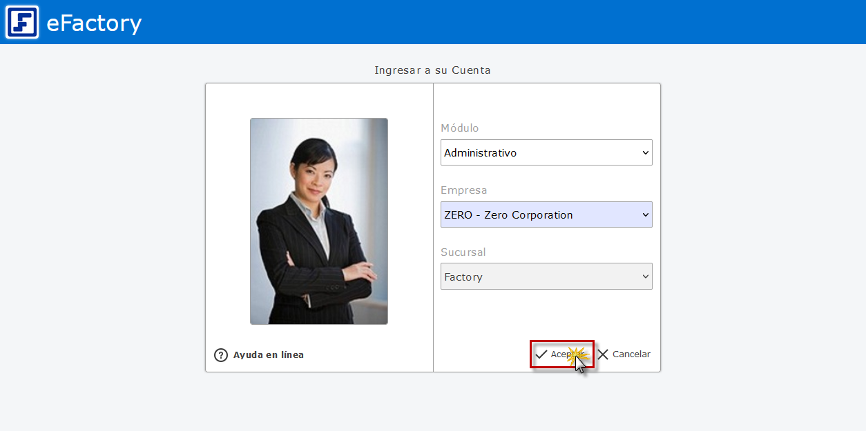 Primero debemos ingresar al sistema de eFactory colocando nuestro usuario y contraseña en la pantalla inicial de eFactory, luego presionaremos el botón de