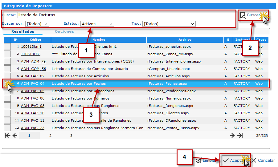 se abrirá la pantalla de Busqueda de Reportes, en esta debemos buscar el reporte que deseamos duplicar,