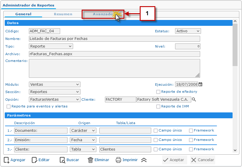 a. Luego de seleccionar el reporte, debemos hacer clic en la pestaña Avanzado.
