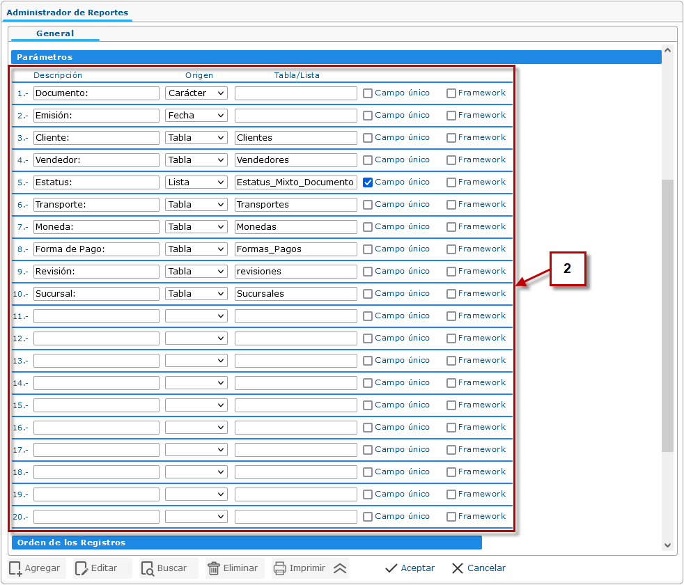 2. En la sección de Parámetros: Podemos agregar o eliminar los filtros que se usarán para abrir el reporte.
