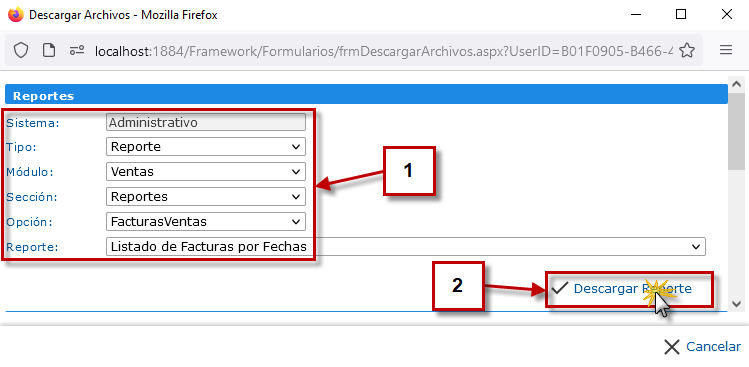 utilizando los filtros del formulario (Módulo, Sección, Opción y Reporte) y por último debemos presionar el botón