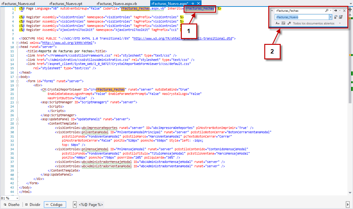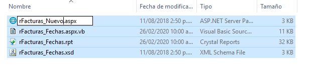 b. Despues de editar el nombre de los archivos fuentes del reporte, debe abrir los archivos en Microsoft Visual Studio y allí debe reemplazar también el nombre anterior de los archivos dentro de los fuentes del reporte.