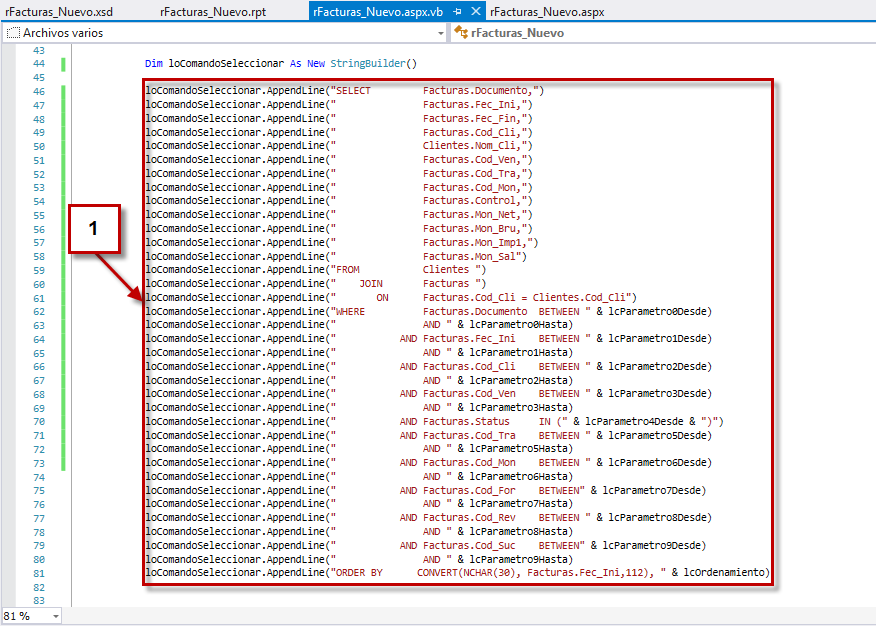 2. En el archivo .aspx.vb: Este es el archivo que recibe los parámetros (Filtros) del reporte y se encarga de hacer la consulta a Base de Datos, en este archivo debemos editar: