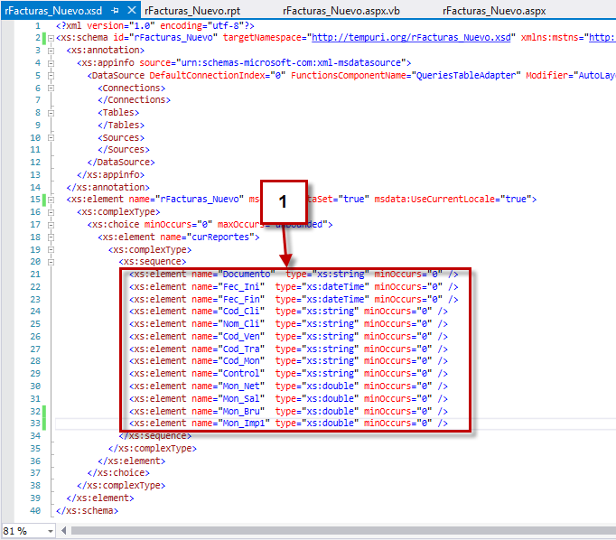 3. En el archivo .xsd: Este es el archivo en el que se definen los campos que se mostrarán en el reporte. En este archivo debe agregar o eliminar los campos que desea ver en el reporte, y asignarles el tipo de dato que traerán de la Base de Datos (dateTime, string, integer, decimal...).