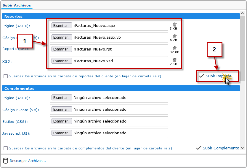 b. Luego de haber seleccionado la opción de Subir Archivos se muestra la pantalla donde debemos subir los 4 archivos (aspx, vb, rpt y xsd) en la sección Reportes y