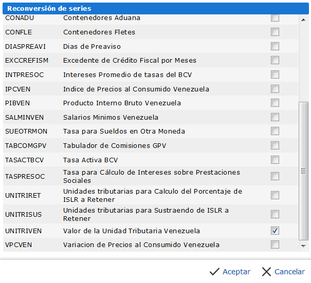 g. Al seleccionar Aplicar Reconversión Series, se nos muestra unas series de elementos donde debemos marcar los campos relacionados con dinero para así aplicar la reconversión por ejemplo, una serie que debe marcarse es Valor de Unidad Tributaria Venezuela.
