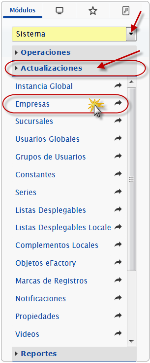 Luego en el módulo Sistema, desplegamos el componente Actualizaciones y activamos el sub componente Empresas.