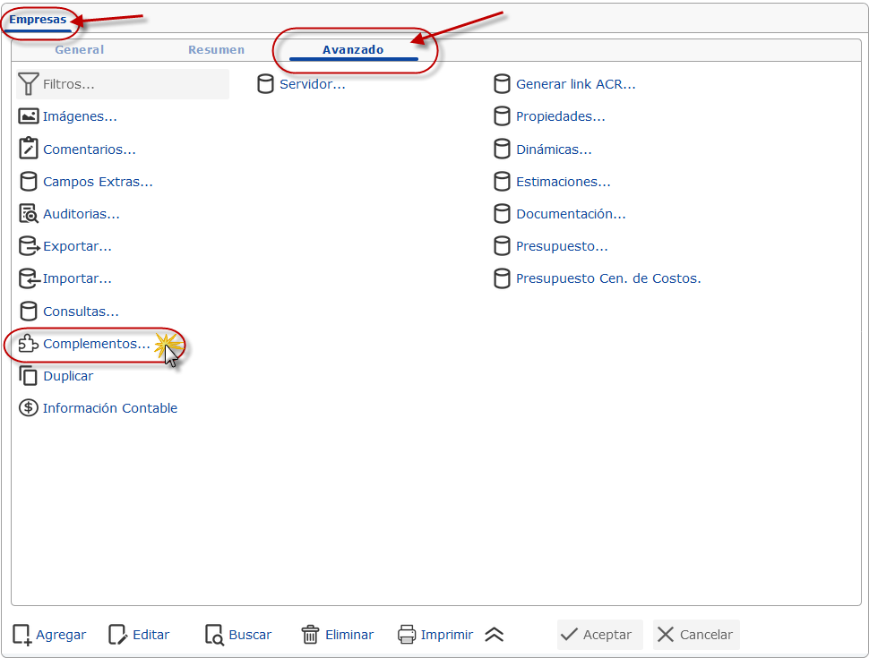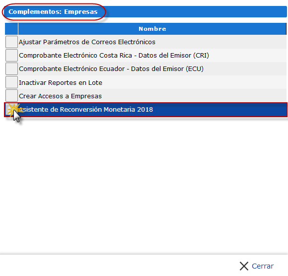 b. Luego se nos muestra la ventana de Complementos: Empresas donde Seleccionamos donde dice Asistente de Reconversión Monetaria 2018.