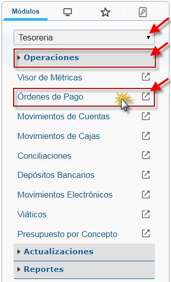 b. En el módulo TesorerÍa, desplegamos el componente Operaciones y activamos el sub componente Órdenes de Pago.