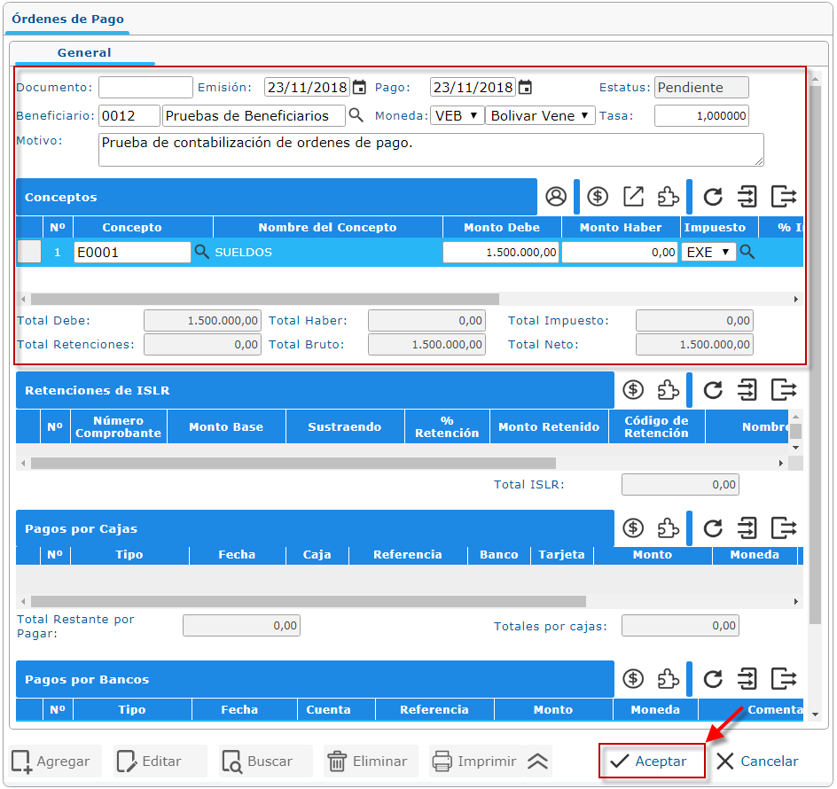 datos en la pantalla Órdenes de Pago por Gastos y procedemos a seleccionar el boton de